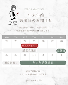 こんばんは♪ ニールのあいかです🐣🐣🐣 隊にラスト1ヶ月になりました⛄️⛄️ 12月まだまだ飲める日沢山あるしクリスマスイベント🎄🎅も予定してるのでラストスパートいっぱい飲みましょ🍻🍻✨ また年末年始の営業は下記の通りになります‼︎ ご予約等承っておりますので是非ご連絡ください🐣🐣🐣 《住所》 〒542-0083 大阪府大阪市中央区東心斎橋2丁目3−29 日宝アネックスビル 5階 《TEL》06-6926-8577 《営業時間》20:00〜25:00